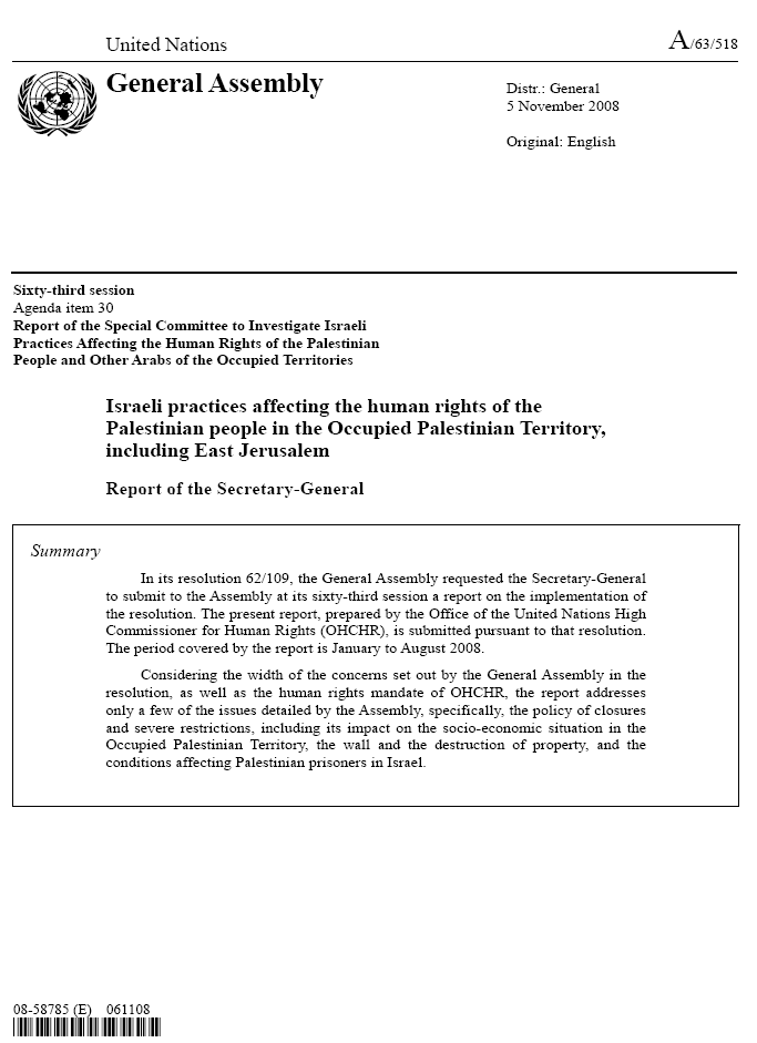 Report of the Special Rapporteur on the Situation of Human Rights in the Palestinian Territories Occupied since 1967, John Dugard / UN Human Rights Council Original Copy |